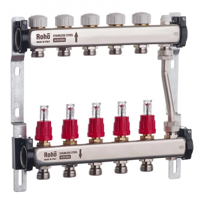 Коллектор с расходомерами и термостатическими клапанами с байпасом Roho R814-05 - 1"х 5 вых. (RO004